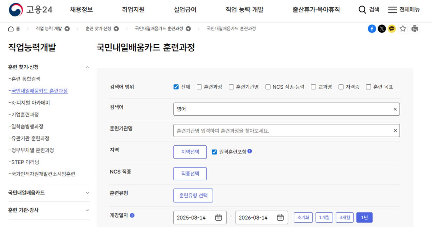 이제 카드가 생겼으니, 우리 아이에게 꼭 맞는 영어 강의를 찾아볼까요? HRD-Net에서 쉽고 빠르게 검색할 수 있습니다.